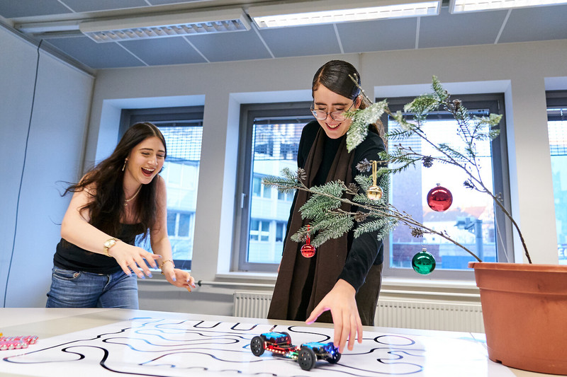 Die 14-Jährige ist Teilnehmerin von mint:dual, einem Programm zur Berufsorientierung junger Frauen. Es wird vom Bund gefördert und von der Initiative NAT in Kooperation mit Schulbehörde und Technischen Universität Hamburg (TUHH) organisiert. Neben zahlreichen beteiligten Unternehmen bietet auch dual@TUHH den Programmteilnehmerinnen ein praktisches Angebot. Wie an diesem Freitag einen Workshop mit dem Titel „Autonom durch ein Labyrinth flitzen“, für den sich Anni zusammen mit zwei Freundinnen angemeldet hat. Für die drei Gyula Trebitsch Schülerinnen ist es der erste Ausflug in die Programmierung und damit in eindeutige Anweisungen, die der Computer sehr schnell von oben nach unten abarbeitet, wie Merle betont. Es ist klar, dass Anni dem Mikrocontroller mehr Zeit geben muss, die Befehle auszuführen: Sie kopiert einen blauen „Pausiere-Block“, fügt ihn vor den Rotationsblock und setzt die Zeitangabe auf zwei Sekunden. Nicht vergessen, die neuen Befehle auf das Microbit-Laufwerk hochzuladen und zu testen. „Ja, jetzt geht es“, freut sich Anni.