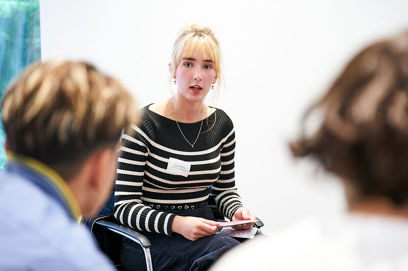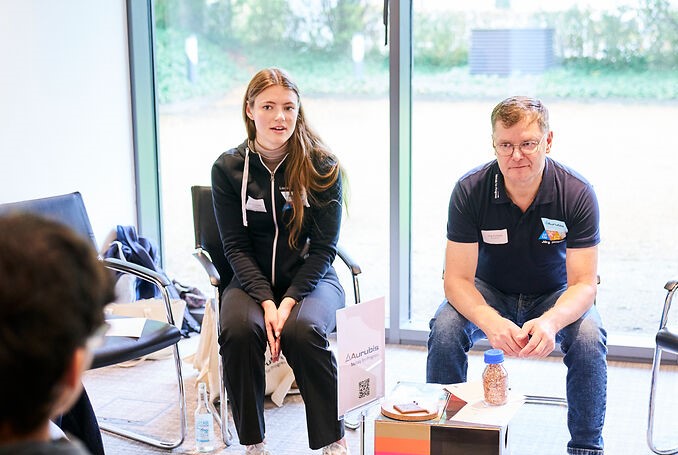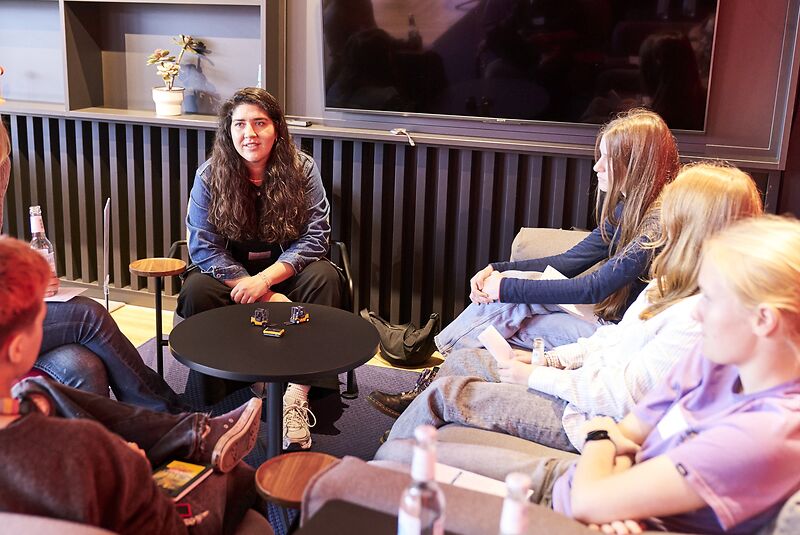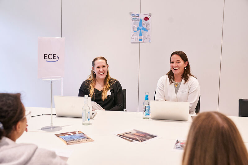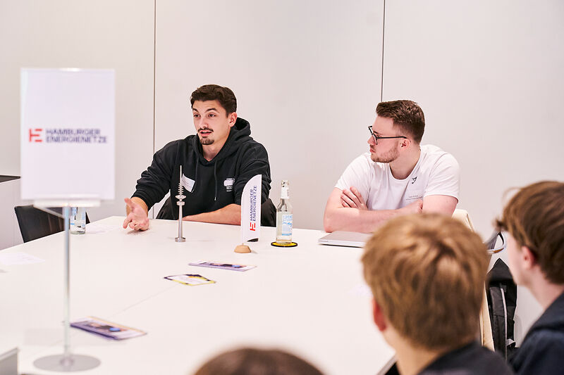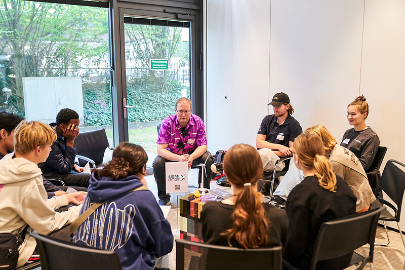 Nach dem Date mit Lukas haben sich die sechs Neuntklässler, drei Mädchen, drei Jungen, einen Sitzkreis weiter bewegt und sind bei Siemens Energy gelandet. Mehr als nur ein Energieerzeuger, wie Azubi Steven Mielczarek deutlich macht. Der angehende Elektroniker für Betriebstechnik arbeitet im technischen Service und betreut Schiffe, die Siemens Motoren, Schaltschränke oder Computersysteme eingebaut haben. „Wir sind viel am Reisen, vor allem in die Häfen weltweit“, sagt er. Seine Kollegin Frida Gerstner hat keine Höhenangst und sich daher für die Sparte „Offshore Installation“ entschieden. „Wir nehmen neue Windparks in Betrieb, auch offshore, auf dem Meer.“ Das heißt, auch Frida ist auf Hotelschiffen weltweit unterwegs. „Als Auszubildende um die Welt zu fahren, das ist ja interessant“, findet Emil-Krause-Schülerin Katayun.