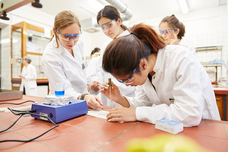 Melissa will sich nicht trennen. Vom weißen langen Kittel und der großen Schutzbrille schon, aber nicht von ihrem ersten eigenen MOF. „Zu schade, dass wir das nicht zu Ende machen können, das wäre so cool“, sagt sie zu ihrer Freundin Mareike. Die hat gerade einen „Linker“ gebaut, so nennen Chemiker organische Moleküle, die zusammen mit metallischen Verbindungen dreidimensionale Netzwerke bilden – „Metal-Organic Frameworks“, kurz MOFs genannt. Für die anorganische Baueinheit ist Melissa zuständig. Fasziniert schaut die Zehntklässlerin auf einen Magnetrührer, der eine petrolfarbige Lösung aus Kupferacetat und Ethanol in Wallungen bringt: „Voll die geile Farbe!“ Als die Schülerinnen ihre beiden Lösungen zusammengießen, wechselt die Farbe zu knallig Türkis und der Stoff kristallisiert aus: ein MOF ist entstanden.