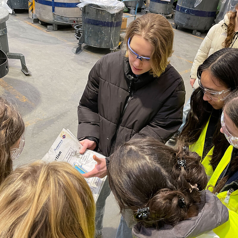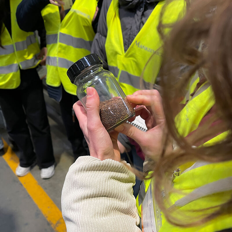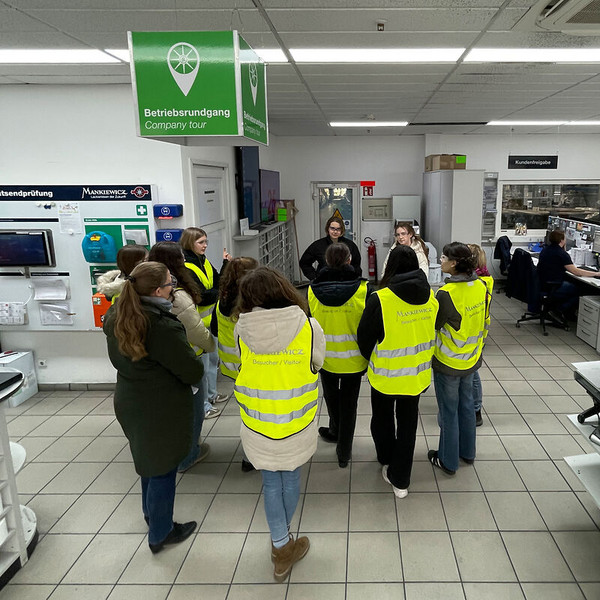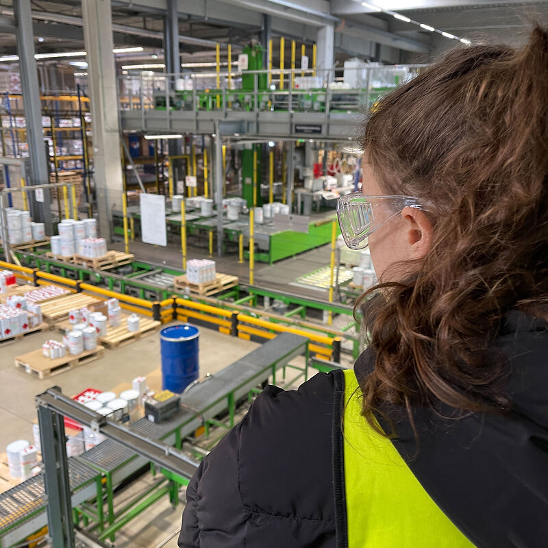 Ein leicht süßlicher Geruch liegt in der Luft, Motorgeräusche, Gebläse und Ventilatoren dominieren. Avi muss sich ordentlich anstrengen, um gegen den Lärmpegel anzukommen: „Hier versetzen wir den Lack mit kleinen Perlen, zwischen ihnen wird das Pulver zerrieben – wie in einer Kaffeemaschine“, sagt die Azubine mit lauter Stimme. Avi ist angehende Lacklaborantin im ersten Lehrjahr und normalerweise in einem der zahlreichen Labore beim Farben- und Lackproduzenten Mankiewicz tätig. An diesem Vormittag führt sie zusammen mit ihrer Kollegin Magda Schülerinnen durch die Fabrik, zunächst in die Warenannahme. „Über 1.500 unterschiedliche Rohstoffe kommen hier an“, so Magda. Mal flüssig, meist pulverförmig, auf jeden Fall müssen die Pigmente, Füllstoffe und Additive gut vermischt werden. Nach einem Rezept, das Menschen wie sie und Magda entwickeln, sagt Avi nicht ohne Stolz.