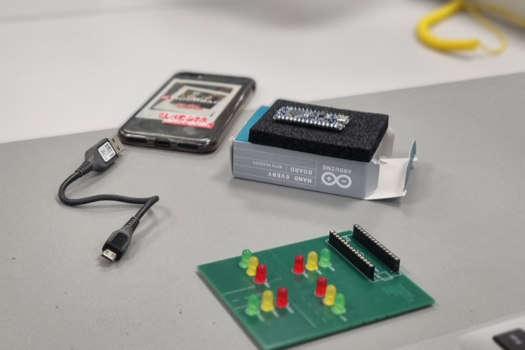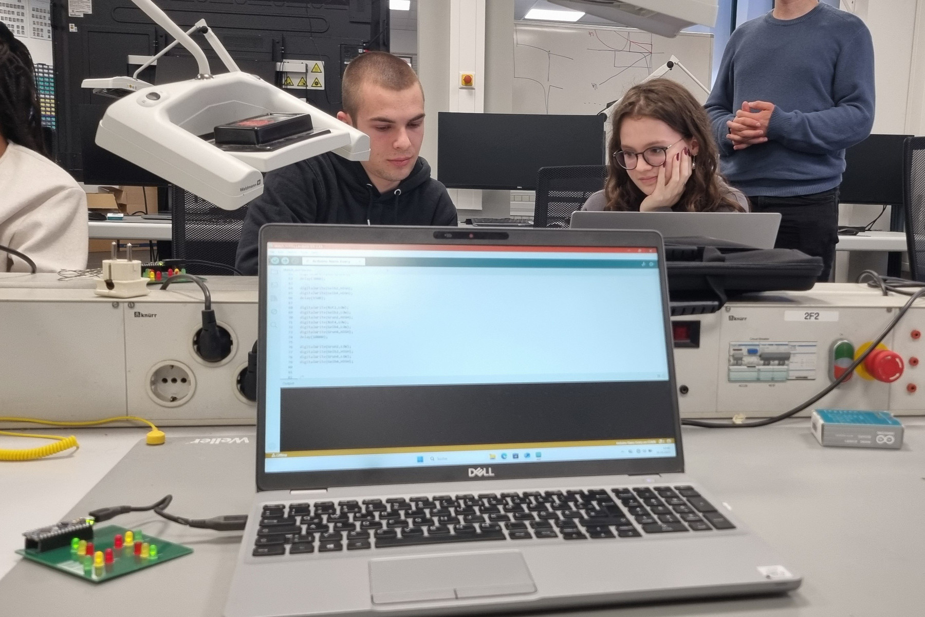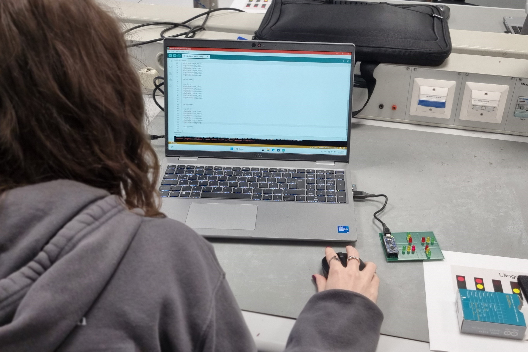 Eine Ampel ohne Rot-Phase mag für manchen Verkehrsteilnehmer ein Traum sein, für den kreuzenden Verkehr ist sie Horror. Daher muss Gloria noch mal an die Arduino Programmierung ran: Konzentriert geht die 15-Jährige den Code auf ihrem Bildschirm Schritt für Schritt durch. Im Hauptteil, englisch „loop“, hat sie per „digitalWrite“-Befehl geschrieben, dass erst die grüne, dann die gelbe, schließlich die rote LED angehen soll, mit welcher Dauer („delay“) und jeden Befehl richtig per Semikolon vom nächsten getrennt. Woran also hapert die Umsetzung? Paula schaut ihr über die Schulter, stutzt und verweist dann auf das „Setup“, den Aufbau der Programmierung. Da fehle noch die Zuordnung, dass der Pin mit der roten Leuchte auch ein Ausgang („OUTPUT“) ist. „So weiß der Controller nicht, dass er da eine Spannung ausgeben soll“, erklärt sie.
