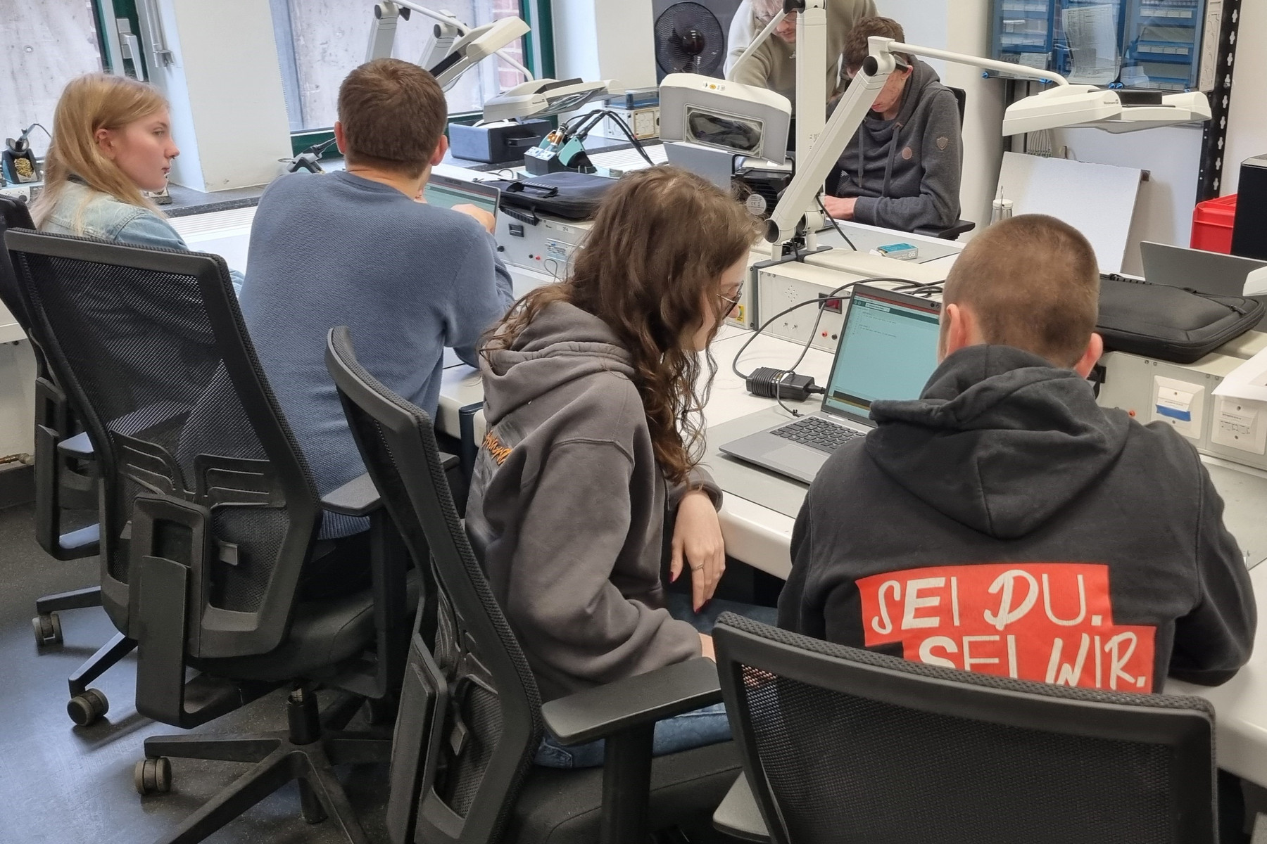 Vor gut zwei Jahren hat Paula selbst Ampelschaltungen am Arduino Mikrocontroller programmiert. Das fand ebenfalls in der Elektronikwerkstatt der Hamburger HOCHBAHN statt und bildete den Auftakt in ihre Ausbildung. „Ich bin EISlerin“, sagt Paula und benutzt das Kürzel der Elektroniker für Informations- und Systemtechnik nicht ohne Stolz. Schließlich ist die Azubine schon im dritten Lehrjahr angekommen und will ihre Begeisterung fürs Programmieren sowie die duale Ausbildung weitertragen. „Du wirst als Elektronikerin gebraucht und im Endeffekt auch besser bezahlt als so mancher Bachelor“, sagt die 23-Jährige. Gloria hat noch nie in ihrem Leben programmiert und sich von ihrer Freundin Emilia zur Expedition in die HOCHBAHN-IT überreden lassen. „Ich habe schon ein bisschen Vorahnung“, sagt Emilia. Die Zehntklässlerin der Stadtteilschule Alter Teichweg will auf jeden Fall eine handwerklich-technische Ausbildung machen und erhofft sich von mint:dual mehr Klarheit. „Elektronik könnte passen“, sagt sie.