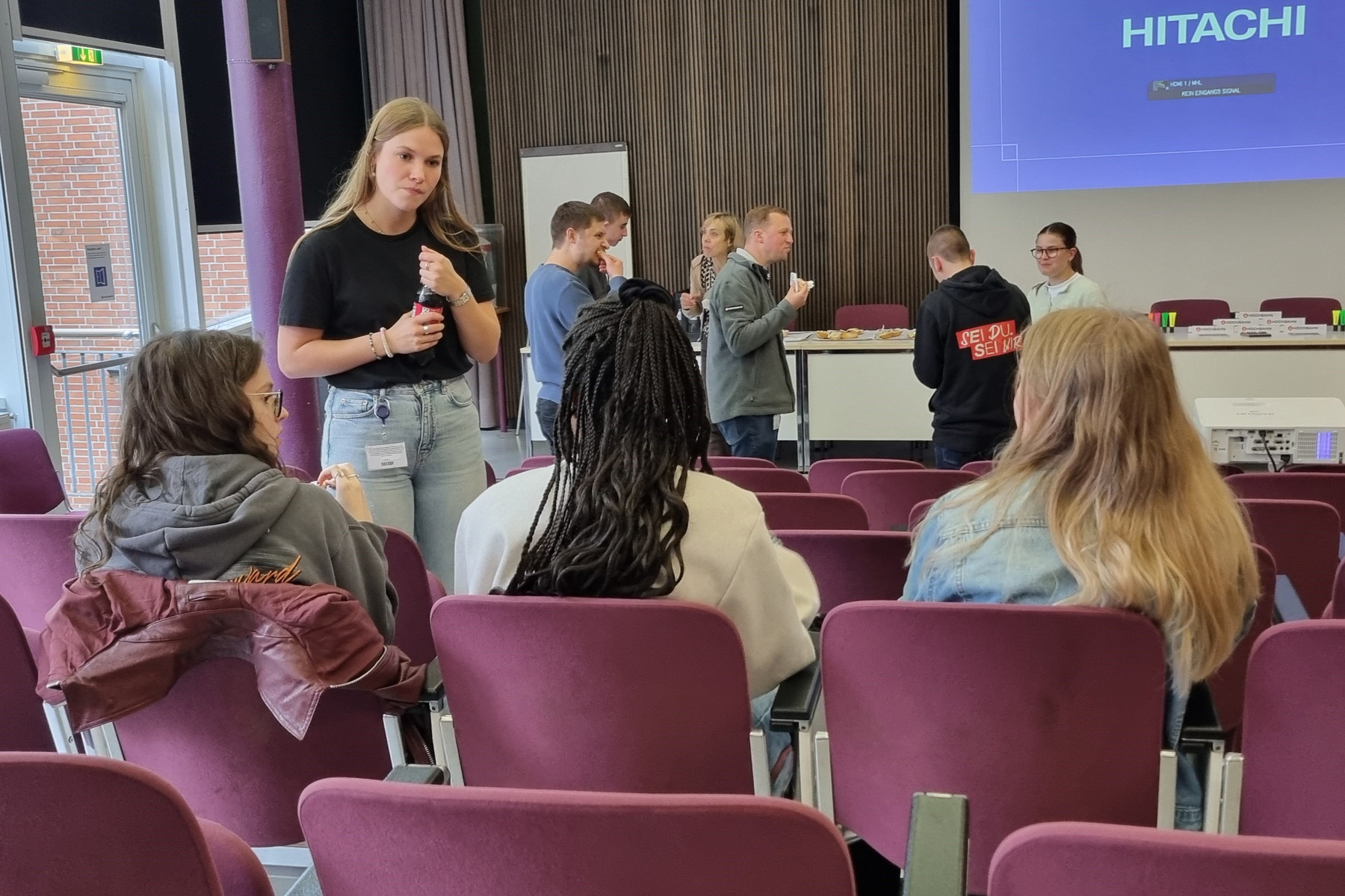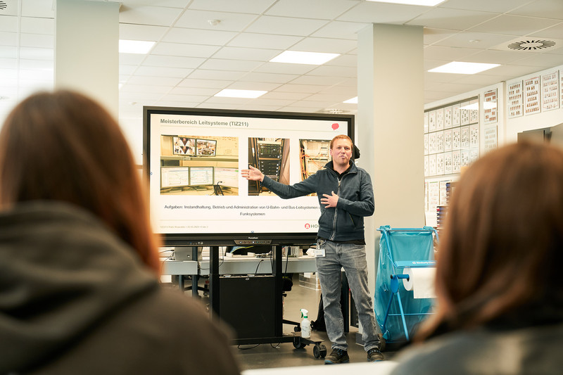 „mint:dual“ ist ein Programm zur Berufsorientierung junger Frauen. Die Schülerinnen registrieren sich für Exkursionen, die sie interessieren und kommen dann selbstständig zu den Terminen. Von parallel stattfindenden Schulveranstaltungen sind sie damit offiziell entschuldigt. Das ist wichtig für die Bewerbung etwa bei der HOCHBAHN, betont Vanessa Lehmann, Referentin für Schulmarketing und Messen. „Man sollte sich bei uns früh bewerben und keine unentschuldigten Fehlstunden im Zeugnis haben“, sagt sie. Per Quiz lernen die Schülerinnen spielerisch, dass die Elektronikerinnen für Betriebstechnik mit Starkstrom von 750 Volt im U-Bahn Netz zu tun haben, während die EISler IT und Elektronik verbinden und beispielweise die Netzwerktechnik überprüfen. Zuständig für Kommunikations- und Sicherheitstechnik sind vor allem EGSler, Elektronikerinnen für Geräte und Systeme – der dritte Ausbildungsberuf der HOCHBAHN mit einem E im Titel.