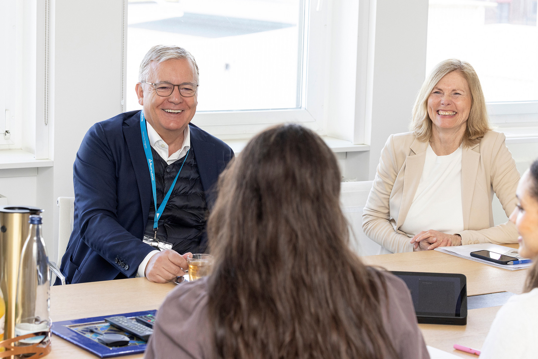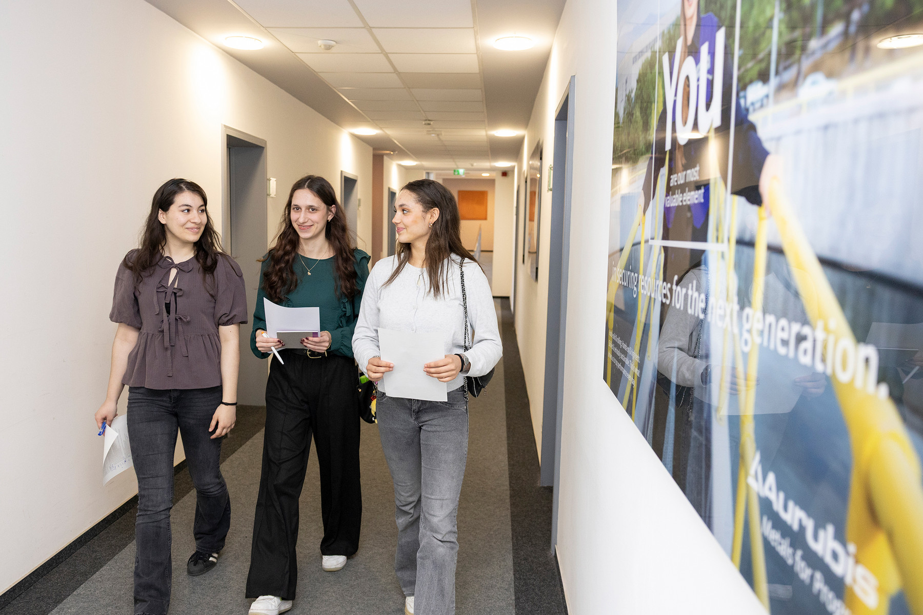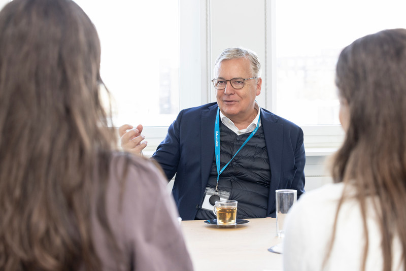 Womit anfangen, wenn man 16 oder 17 Jahre alt ist und zum ersten Mal in seinem Leben das Büro eines Vorstandsvorsitzenden betritt? Zunächst einmal sammelt man Eindrücke: Wie aufgeräumt, hell und freundlich die Aurubis Chefetage ist, dass das kupferne Firmenlogo so ziemlich die einzige visuelle Ablenkung an der Wand ist und Toralf Haag selbst ein zugewandter Gastgeber vor einer Tasse Tee. Seine Entspannung überträgt sich schnell auf die drei Schülerinnen, die das Programm mint:dual mit dem Konzernchef zusammengebracht hat. Es will für mehr weiblichen Nachwuchs in der dualen MINT-Ausbildung sorgen. Aurubis ist einer der Programmpartner und hat bereits im letzten Jahr zu einem „Markt der Möglichkeiten“ in die Zentrale geladen. Dieses Mal geht es zwei Etagen höher und Sophie-Barat-Schülerin Emilia, Guyla-Trebitsch-Schülerin Latifah sowie Elmira vom Gymnasium Harksheide dürfen groß denken – und vor allem Fragen stellen.
