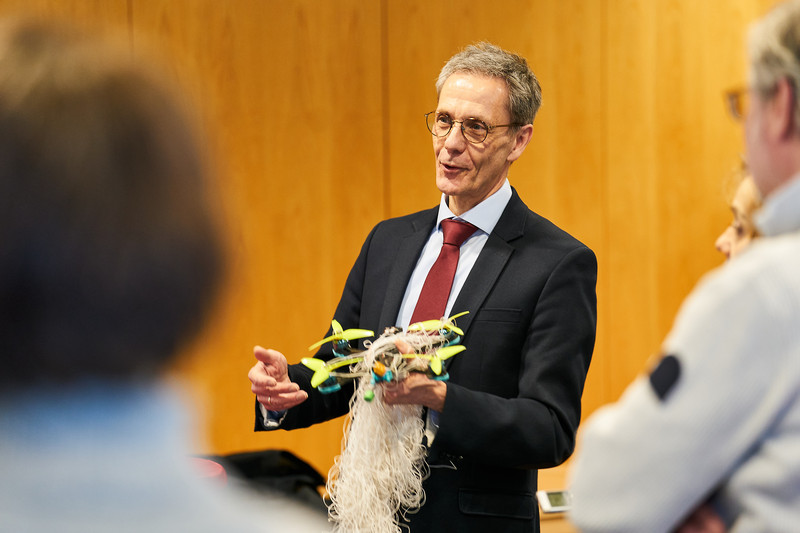 Rückenwind für das Team um Gerd Scholl, Professor für Elektrische Messtechnik. „Wir sind die mit den Netzen und den Drohnen“, sagt der Professor und hält ein Netz mit vielen kleinen Drohnen in der Hand. Symbol für seine Forschung zu Sensorik und Kommunikationstechnik, aber auch für die Netzwerfer-Drohne „Falke“, die das HSU-Team entwickelt hat. „Eine Drohne ist ja nur ein umgedrehter Staubsauger. Alles, was sie von oben kriegt, saugt sie begehrlich auf“, erklärt der Wissenschaftler das Prinzip und zeigt in einem Video, wie das dazugehörige Drohnenabfangsystem funktioniert: Sensorik am Boden detektiert die nicht autorisierte Drohne am Himmel und navigiert die Abfangdrohne zum sogenannten „Rendez-vous-Punkt“: Ein romantischer Begriff für die Stelle, ab der die „Falke“-Sensorik das feindliche Fluggerät ins Visier nehmen kann. Der Rest hängt am Wind und der Flugdynamik: „Die Drohne entscheidet am Ende selbst, wann sie auslöst, da ist relativ viel Algorithmik drin“, sagt Gerd Scholl.