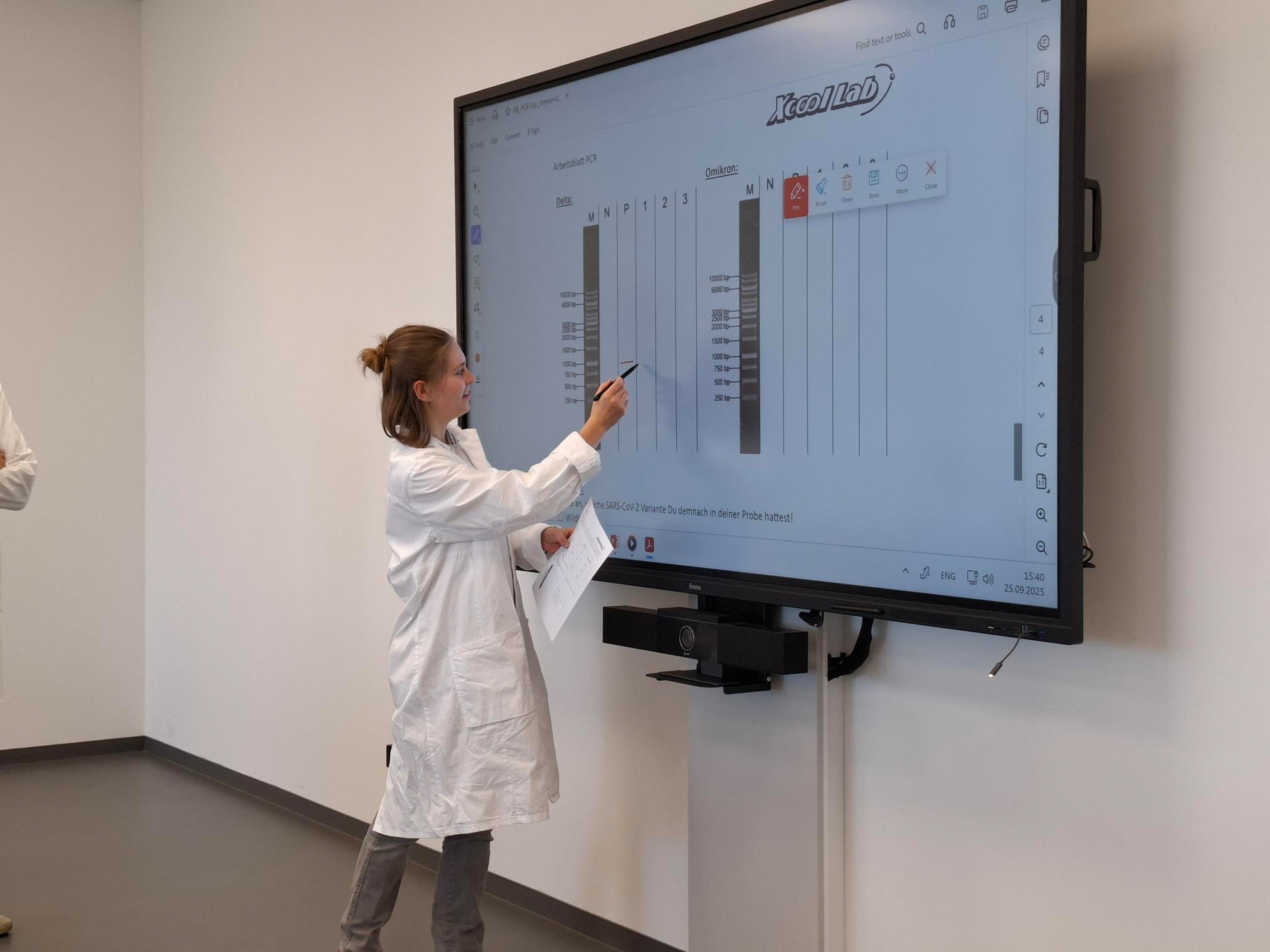Sichtbar wird in der ersten Spur erst mal nichts – und das ist genau richtig: „Das ist die Negativkontrolle“, sagt Natascha. In der zweiten Spur, der Positivkontrolle, ist dagegen überall ein Produkt zu erkennen, heißt, die PCR hat prinzipiell funktioniert. Nun müssen die Mädchen die Signale innerhalb einzelner Spuren nur noch mit der Tabelle abgleichen, die über die Bindung zwischen Primer und Virusvariante Auskunft gibt. Delta, Omikron und Wildtyp werden so blitzschnell von den Schülerinnen detektiert. „Ich hätte nicht gedacht, dass es so genau ist – und dass Corona so viel Spaß machen kann“, lobt Lene den Bezug zur Praxis und zum Alltag. Am liebsten möchte die Albrecht-Thaer-Gymnasiastin noch mal mit der ganzen Klasse vorbeikommen und fragt nach den Kosten. Als sie erfährt, dass das Xcool Lab ein Gratisangebot ist, entfährt es der Zehntklässlerin: „Dann kommen wir schon bald.“
