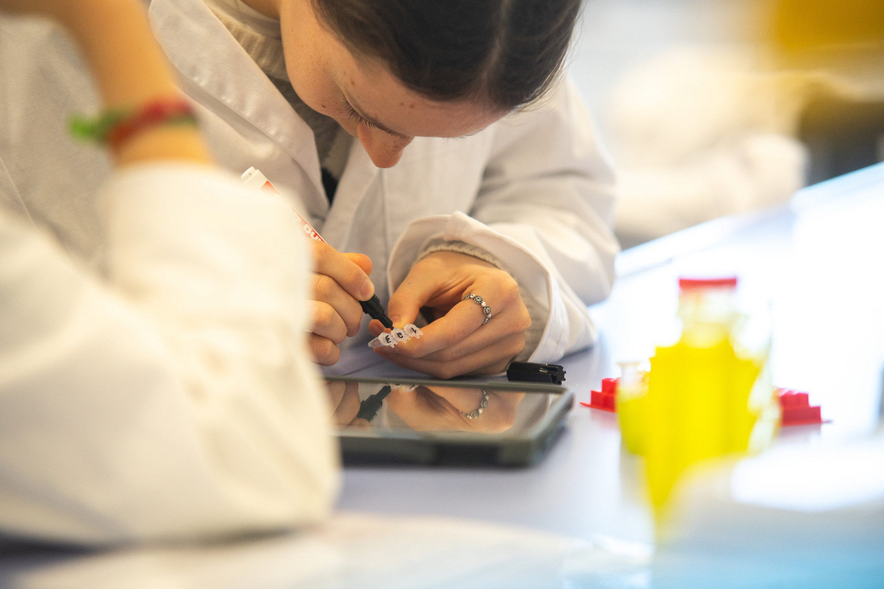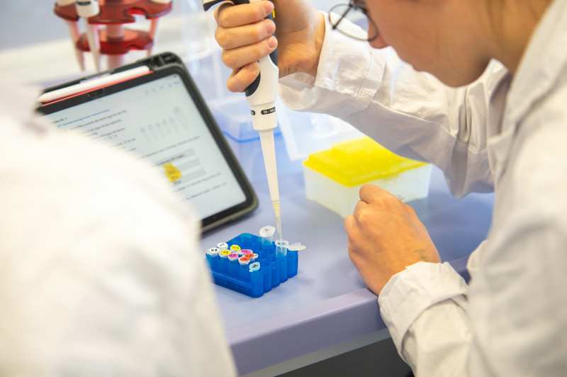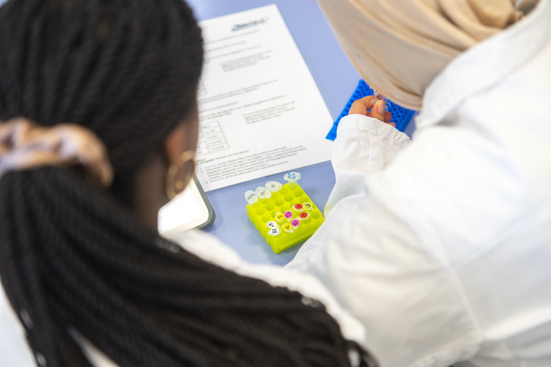 Laura meldet sich: „Das ist schon eine Weile her bei mir, aber ich meine, dass kleine DNA-Teile damit vervielfältigt werden können.“ „Perfekt“, lobt Dr. Sebastian Frerichmann und führt von der Polymerase-Kettenreaktion ins Pipettieren ein. Man braucht schon eine ruhige Hand, um mit den kleinen Mengen umzugehen. „Hast du richtig runtergedrückt“, fragt Laura, als aus Nataschas Pipette nur ein kleiner durchsichtiger Tropfen fällt. „Das könnte schon reichen“, meint Natascha. Es reicht. Der PCR-Test ist so sensitiv, dass geringste Mengen genügen, um das Virus nachzuweisen. Aber um welche Virusvariante handelt es sich? Dazu benutzen die Mädchen eine zweite Methode, die DNA sichtbar macht. „Wir haben einen Farbstoff, der an die DNA bindet und unter Blaulicht sichtbar wird“, erklärt der Molekularbiologe der Gruppe.