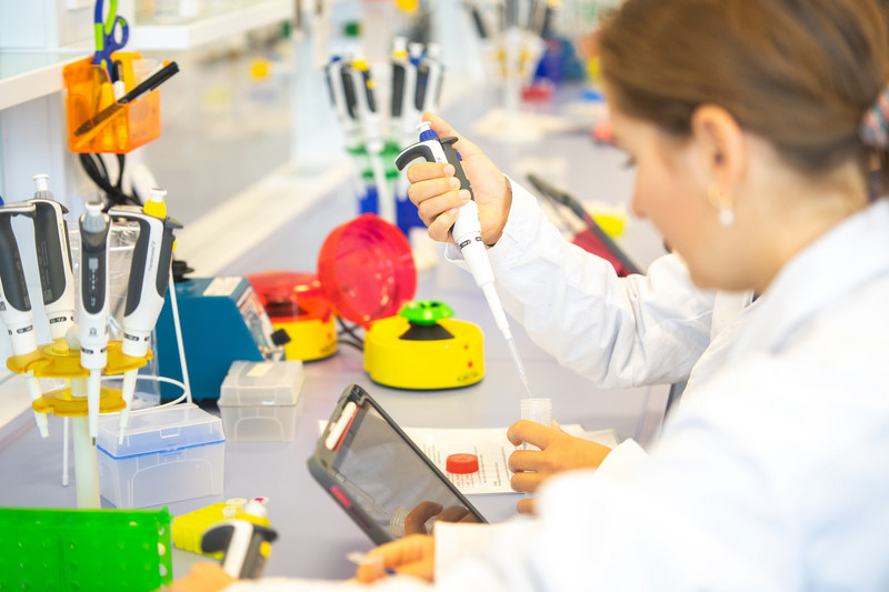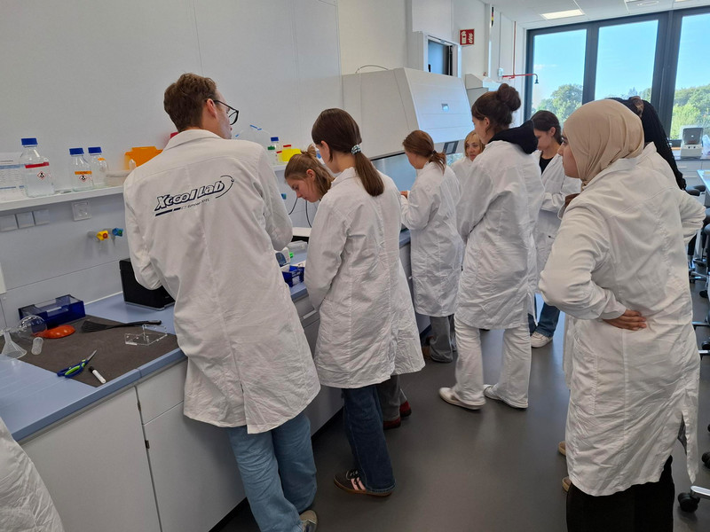 Zentrifugieren, pipettieren und dann alles gut vermengen – für Laura und Natascha kein Problem. „Einmal durchmischen, das geht mit dem Vortex-Mischer“, erklärt Laura. Im hellen, hochmodernen Schullabor Xcool Lab am European XFEL fühlt sich die Chemieprofilschülerin vom Gymnasium Grootmoor in ihrem Element. Mit Natascha teilt sie weder die Schule noch die Stufe, wohl aber die Begeisterung für naturwissenschaftliche Exkursionen und nun auch den Labortisch. „Ich möchte so viel wie möglich ausprobieren“, sagt Natascha. Die Zehntklässlerin vom Buckhorn-Gymnasium nimmt am aktuellen mint:pink Programm teil. Allerdings machen die Exkursionen rund um die großen Ferien eine Pause. Wer mag oder zu den Alumni gehört, kann sie mit freiwilligen Sommerangeboten verkürzen.