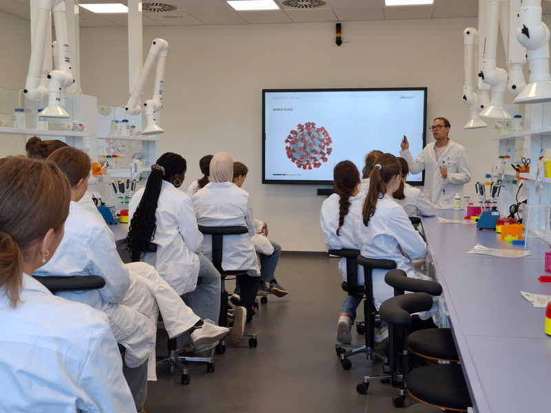 Zwölf Mädchen haben das an diesem Donnerstagnachmittag getan und keine Mühe gescheut, um von Bergedorf, Norderstedt oder eben Volksdorf bis nach Schenefeld zu kommen. Ganz wie die Forschenden, die sich aus aller Welt für eine Experimentierzeit am European XFEL bewerben. „Die Abkürzung steht für X-Ray Free-Electron Laser, den weltweit größten Röntgenlaser, der auch die Struktur von Molekülen entschlüsseln kann“, erklärt Sebastian Frerichmann. Der promovierte Molekularbiologe ist für die biologischen Angebote im neuen Schullabor verantwortlich. Sowohl zur Erforschung des Corona-Virus als auch bei der Impfstoffherstellung habe European XFEL einen Beitrag geleistet. Da ist die Aufgabenstellung für die Mädchen nur konsequent: „Ihr arbeitet als diagnostisches Labor und wertet Corona-Proben aus.“ Das sei ganz ungefährlich, versichert der Anleiter, weil man nur mit der äußeren Zellstruktur arbeite. „Die Methode heißt PCR, habt ihr schon mal davon gehört?“